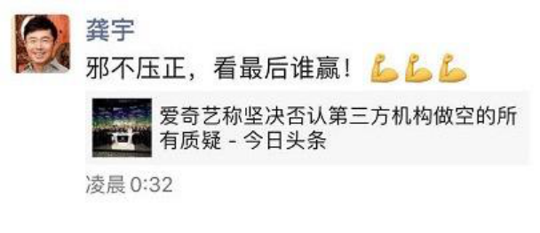 龚宇两条朋友圈信息真实性被爱奇艺内部人士证实,看上去是“自信满满”。