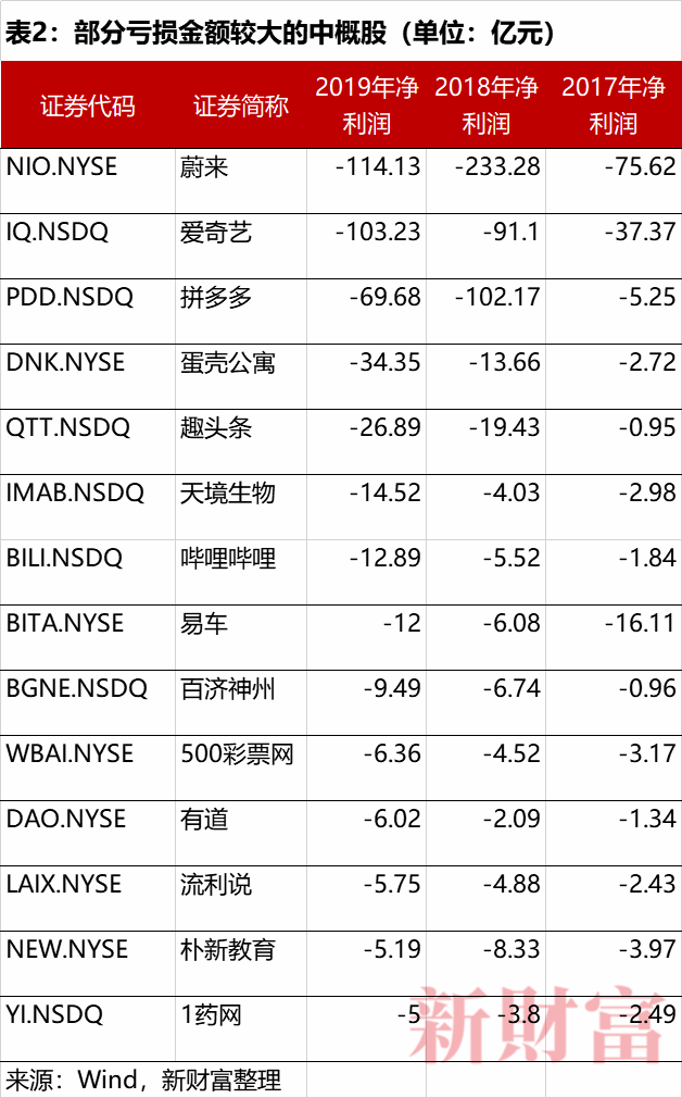 在美国上市的中概股,上市以来从未盈利的公司并不罕见。比如蔚来汽车,2018年上市,最近三年分别亏损75.62、233.28、114.13亿元,累计亏损421亿元,远远高过特斯拉(TSLA.NSDQ)上市前后亏损金额(51亿元)。