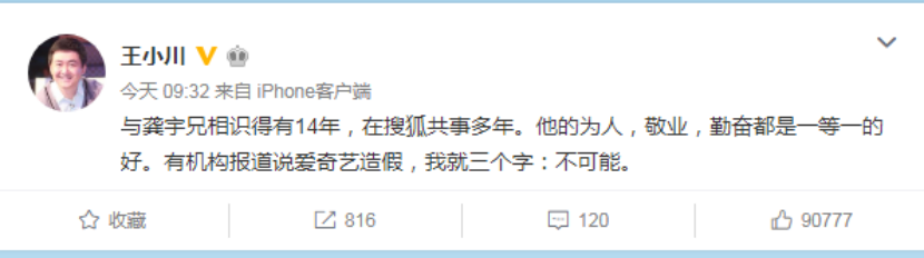 ,则在微博上力挺龚宇。4月8日早间,王小川发布微博称,“与龚宇兄相识得有14年,在搜狐共事多年。他的为人,敬业,勤奋都是一等一的好。有机构报道说爱奇艺造假,我就三个字:不可能。”此条微博动态,至今天16点,点赞数超过9万。